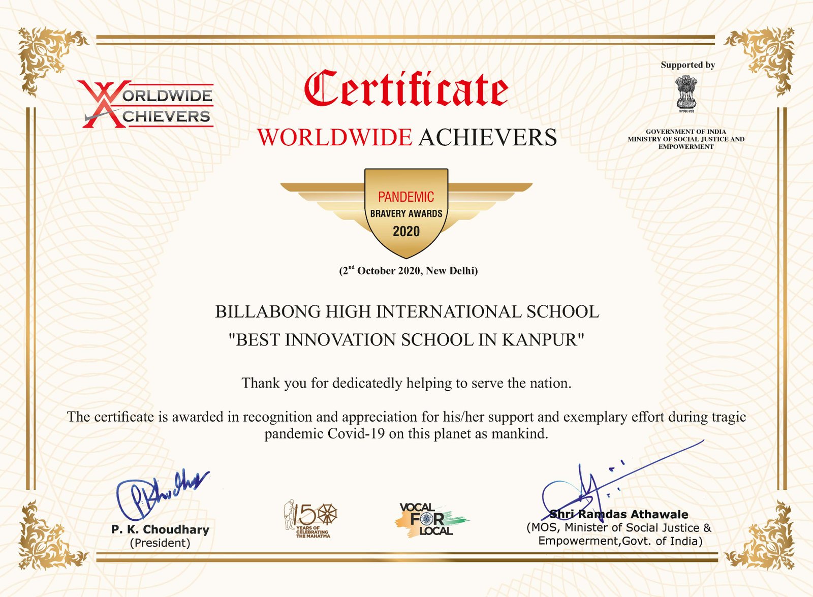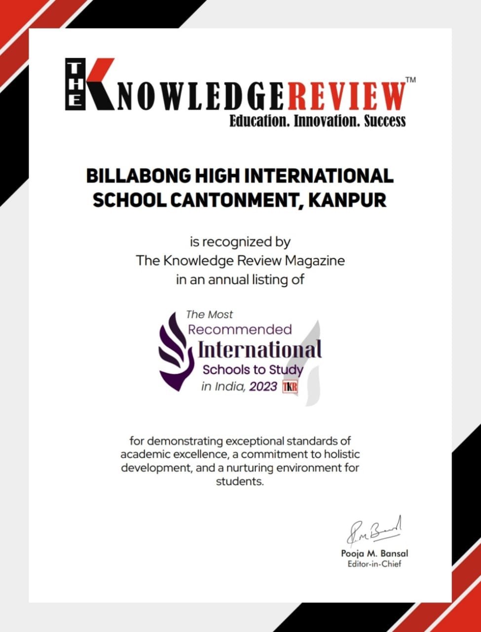 BILLABONG HIGH INTERNATIONAL SCHOOL, CANTONMENT, KANPUR, INDIA AWARDED FOR BEING AN EXCEPTIONAL SCHOOL IN BEST PRACTICES