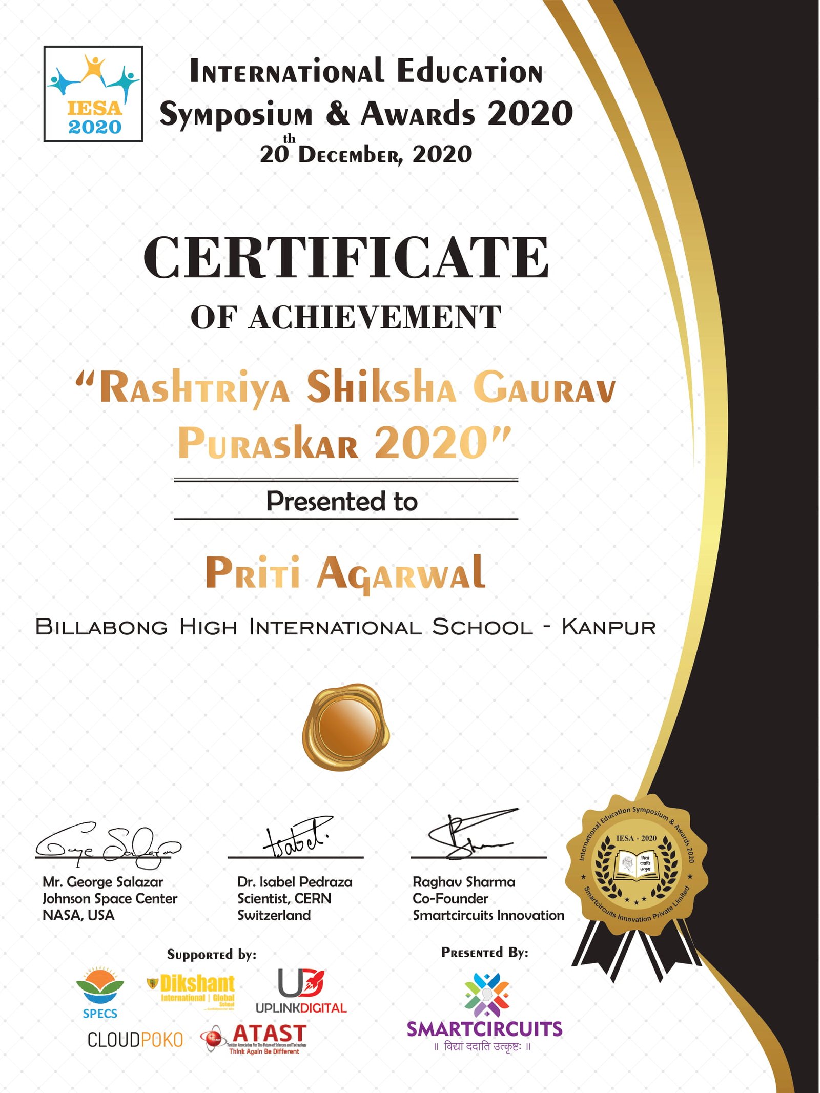- Rashtriya Shiksha Ratan Award at the National Achievers Recognition Forum