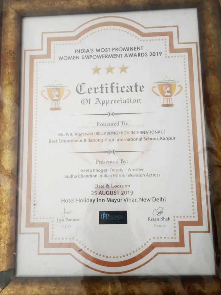 It’s is an extremely proud moment for all the teachers, students and parents associated with Billabong High International School, Cantonment, Kanpur that our founder, Ms. Priti Agarwal, has been appreciated at ‘India’s Most Prominent Women Empowerment Awards-2019’