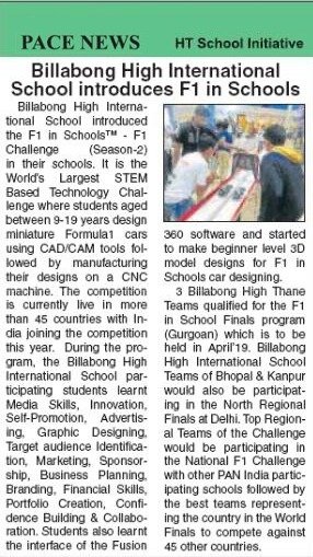 The F1 challenge for designing Formula1 car models in schools was covered in HT pace print media.