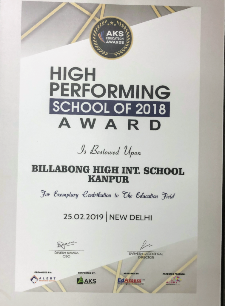 High Performing School Award By Billabong High Kanpur on February 27, 2019 in News Billabong High International School, Kanpur has been awarded as the ‘High Performing School of 2018’ for its exemplary contribution to the education field. This award was presented at the India Education Conclave organised by AKS Education.